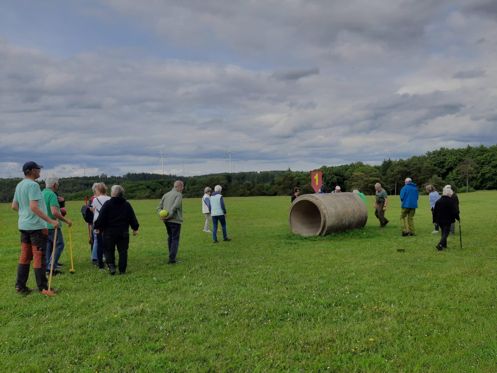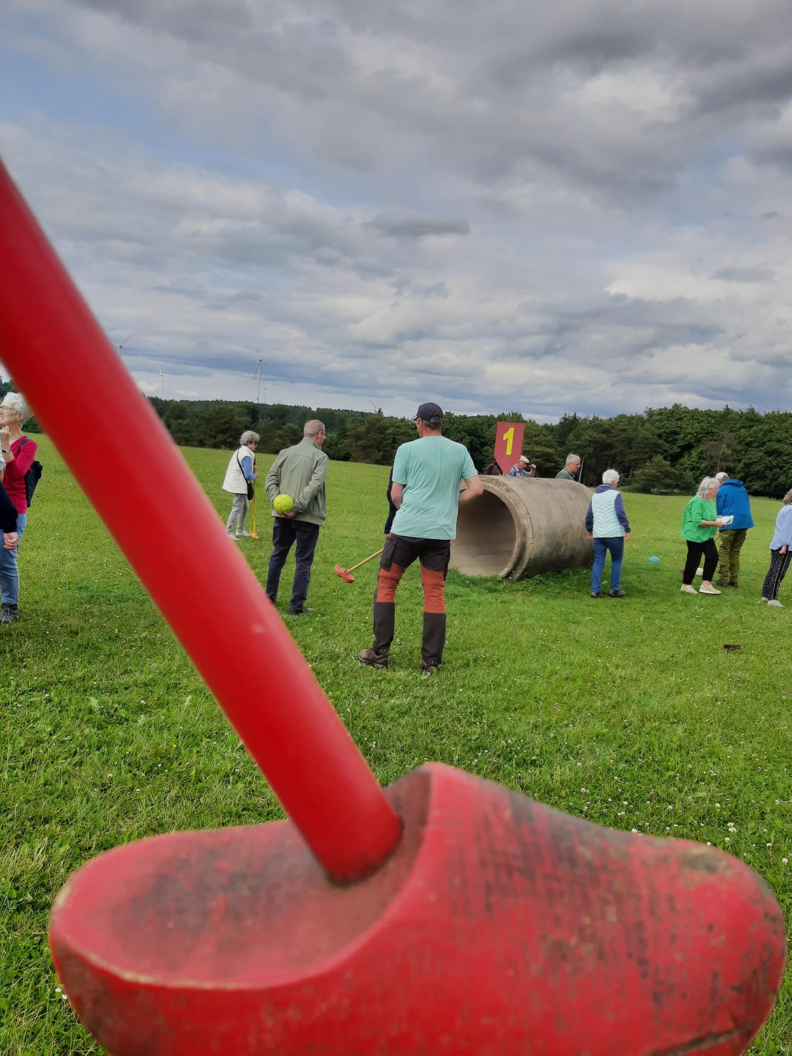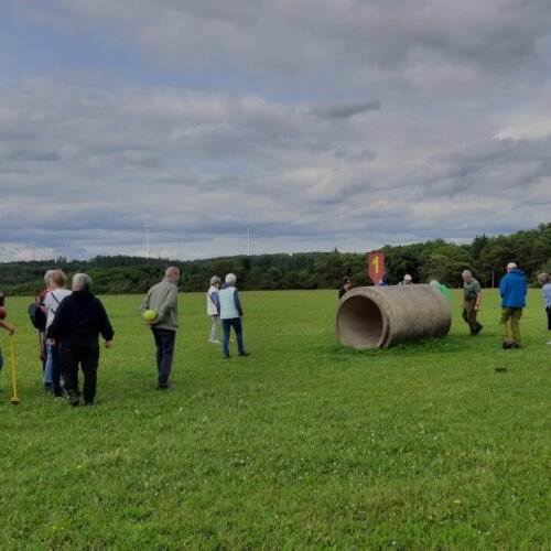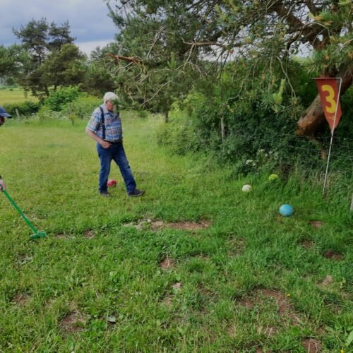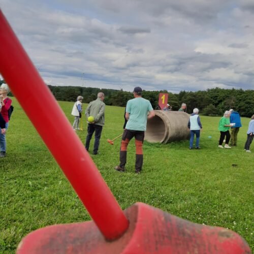 Wir spielen Bauerngolf Am 4. Juni 2025 haben wir uns auf dem Margaretenhof in Kall getroffen, um gemeinsam Bauerngolf zu spielen. Das ist unser Schläger Zu zaghaft ist auch nicht gut Durch diese Röhre muss der Ball Warten in sicherer Entfernung Auf den letzten Metern nicht zu behutsam schlagen Ulrike hatte Erfolg Einer ist in Aktion, die anderen schauen zu Hier soll der Ball hinein…. Joachim ist am Schlag