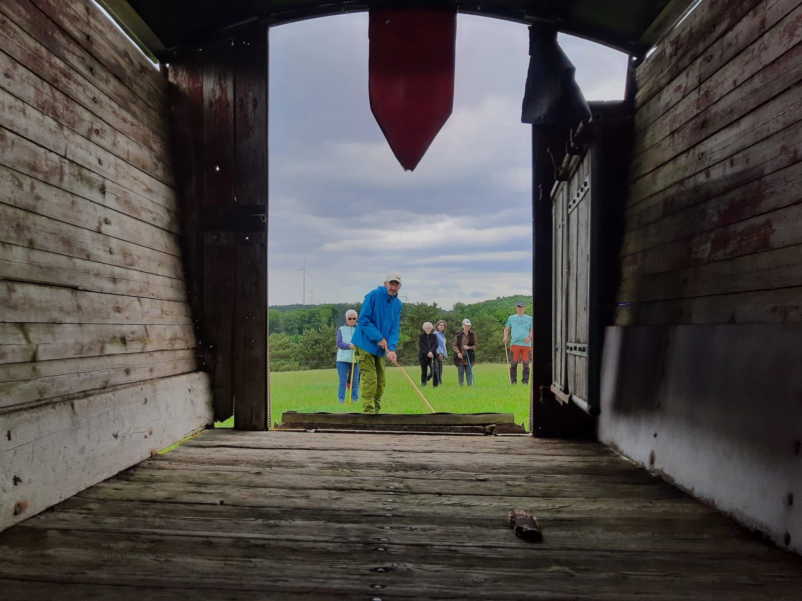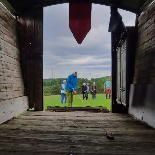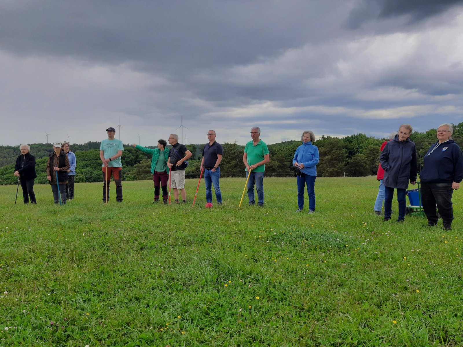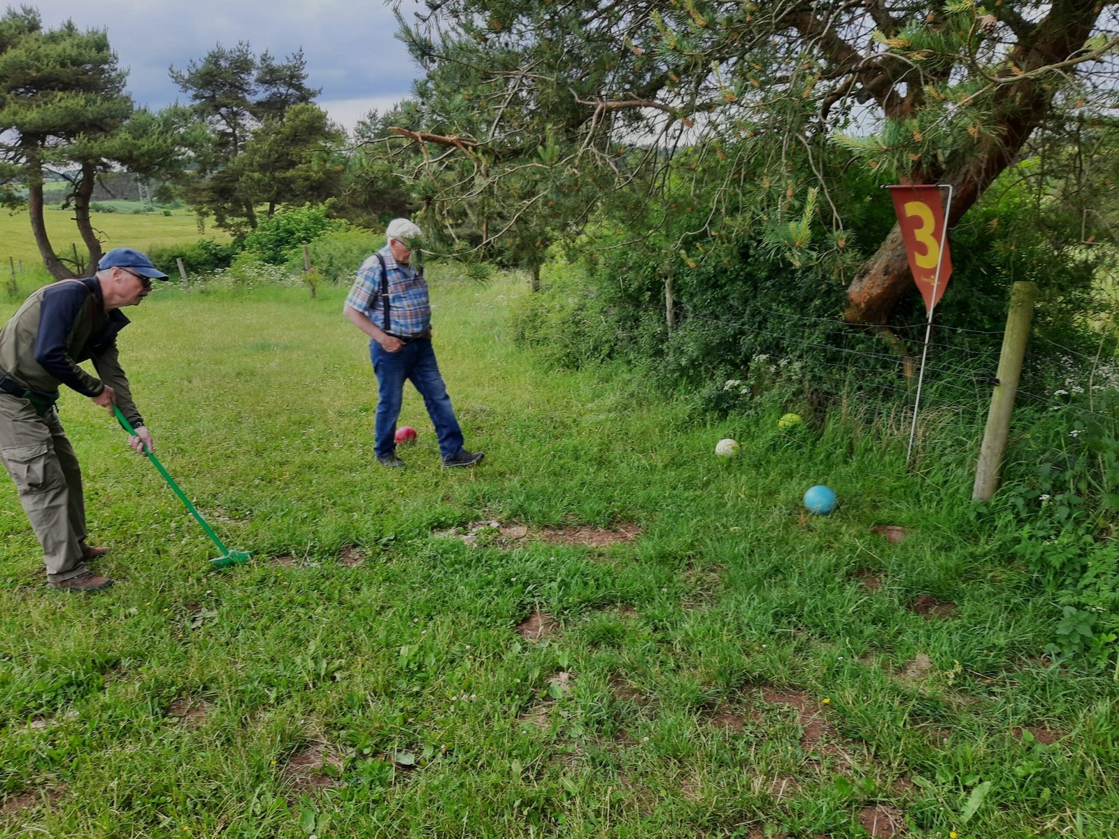 Wir spielen Bauerngolf Am 4. Juni 2025 haben wir uns auf dem Margaretenhof in Kall getroffen, um gemeinsam Bauerngolf zu spielen. Das ist unser Schläger Zu zaghaft ist auch nicht gut Durch diese Röhre muss der Ball Warten in sicherer Entfernung Auf den letzten Metern nicht zu behutsam schlagen Ulrike hatte Erfolg Einer ist in Aktion, die anderen schauen zu Hier soll der Ball hinein…. Joachim ist am Schlag